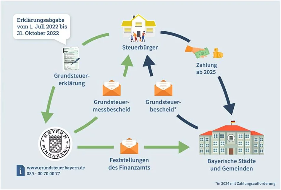 In Bayern wurden alle Grundstückseigentümer vom Finanzamt aufgefordert, eine Grundsteuererklärung abzugeben. Maßgebend sind für die Erklärung die Eigentumsverhältnisse zum 1. Januar 2022. Nach diesem Zeitpunkt eingetretene Änderungen der Eigentümer sind direkt an das Finanzamt zu melden.