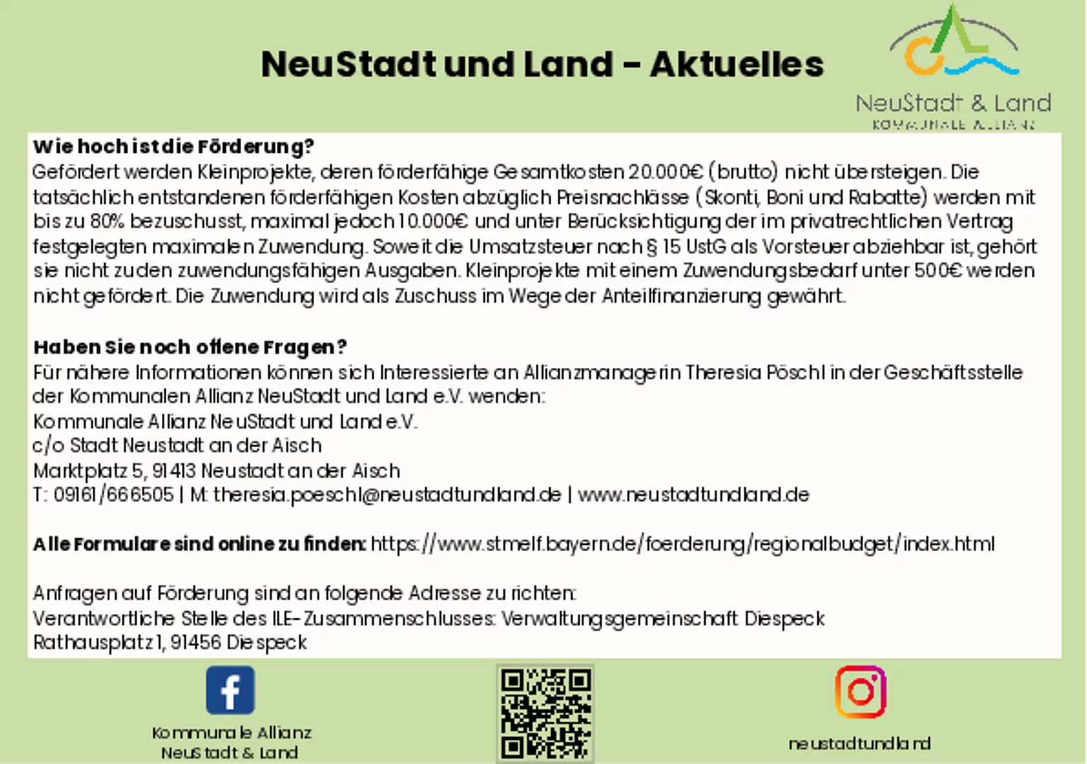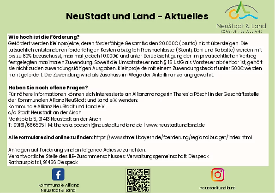 Alle weiteren Informationen finden Sie unter Regionalbudget – Kommunale Allianz NeuStadt und Land